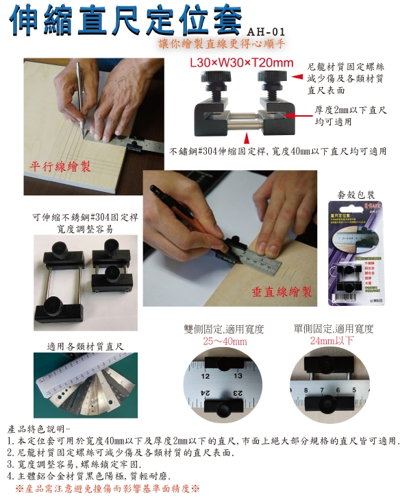 1. 可用於寬度40mm以下及厚度2mm以下的直尺,市面上大部分的直尺皆可適用